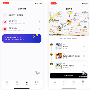 피크민은 하루 동안의 이동 경로를 지도 위에 기록하고, 이를 게임 세계관에 맞춘 애니메이션으로 다시 보여줘요. 실제 장소를 그대로 재현하기보다, 사진과 동선을 엮어 '그날의 이동 경험'을 회상할 수 있게 만듭니다.