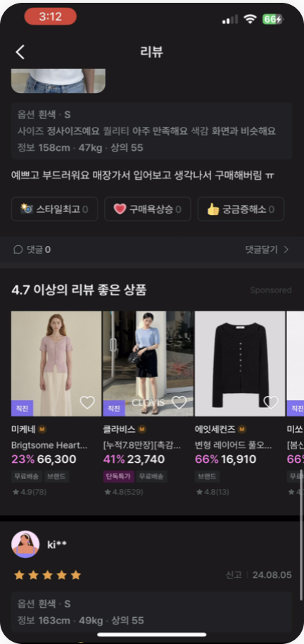지그재그는 상품 리뷰 화면에서 "평점 4.7 이상의 리뷰 좋은 상품" 리스트를 리뷰 목록 중간에 함께 제공합니다.