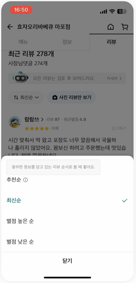 배달의 민족은 리뷰 정렬 필터를 통해 사용자가 원하는 기준에 맞게 후기를 확인할 수 있도록 구성했습니다.