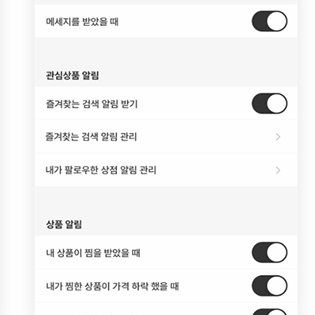 번개장터의 사용자는 판매자이면서 동시에 구매자입니다. 따라서 판매와 구매, 두 가지 상황에서 서로 다른 알림이 필요해요. 번개장터는 이를 고려해 역할별 알림을 구분하고, 사용자가 직접 필요한 알림을 선택할 수 있도록 설계했어요. 사용자가 정보의 흐름을 스스로 제어하도록 한 주도적 경험이 인상적입니다.