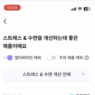 필라이즈는 사용자의 건강 고민과 관심사에 맞춰 다양한 건강기능식품을 추천합니다. 이때, '멀티 비타민 제외', '주의 성분 제외' 등의 필터를 적용해 사용자가 자신의 상태에 맞는 제품만 선별할 수 있도록 도와요. 단순 상품 검색을 넘어, 건강 데이터에 기반한 개인화 경험이 맞춤 추천의 정교함을 높입니다.
