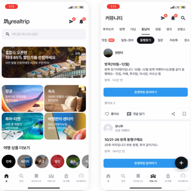 마이리얼트립은 여행 동행을 찾는 사용자를 위해 ‘동행 채팅 참여하기’ 버튼을 제공합니다. 단순한 매칭을 넘어, 일정 조율·역할 분담·예산 논의 등 실제 여행 준비가 채팅에서 이뤄진다는 사용 패턴을 반영한 설계예요. 핵심 행동을 바로 시작할 수 있도록 버튼을 전면에 배치해 자연스러운 참여를 유도합니다.
