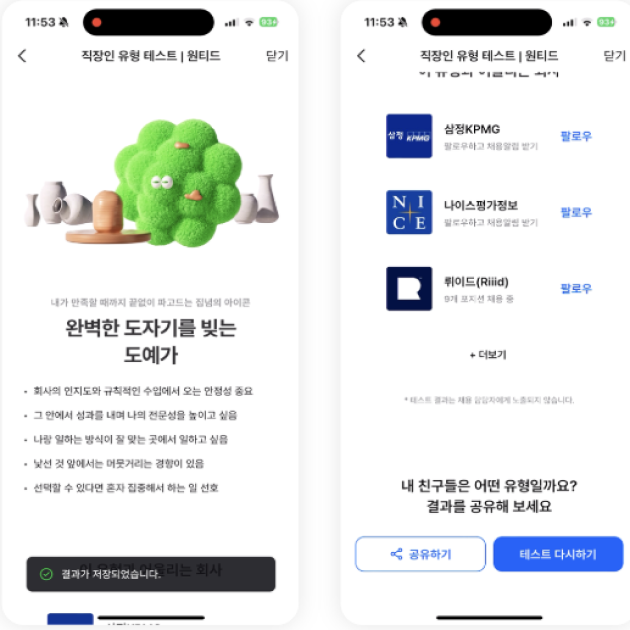 원티드는 취준생·이직 준비생의 호기심을 '직장인 유형 테스트 게임'으로 먼저 자극한 뒤, 게임 마지막 단계에서 자연스럽게 직무 공고 탐색으로 연결합니다. 가벼운 참여를 실제 탐색 행동으로 전환하는 이 흐름은 게임을 전환 진입점으로 활용한 전략이 눈에 띕니다. |