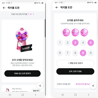 지그재그는 사용자가 매일 참여할 수 있는 '럭키볼' 이벤트를 운영합니다. 일정 마일리지를 내고 번호를 선택하면, 실제 로또처럼 추첨 결과를 기다리는 구조에요. 익숙한 방식에 일일 반복 참여 규칙을 더해 자연스럽게 재방문을 유도합니다.