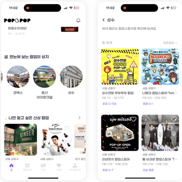 팝앱팝은 팝업 위치, 정보, 리뷰를 리스트 형태로 보여주는 서비스입니다. 프레잼이 지도 위에서 POI 마커로 실시간으로 인기 팝업을 보여줬다면, 팝앤팝은 '성지'라는 카테고리를