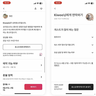 에어비앤비는 서비스 특성상, 시차로 인해 실시간 소통이 어렵습니다. 이를 고려해 호스트에게 메시지를 보내기 전 자주 묻는 말을(FRQ) 먼저 노출해 기본적인 궁금증은 셀프 해결하도록 유도해요. 실제 예약 결정에 필요한 내용만 대화로 이어지도록 설계해 상호 간 소통의 질과 효율을 높인 점이 돋보입니다.