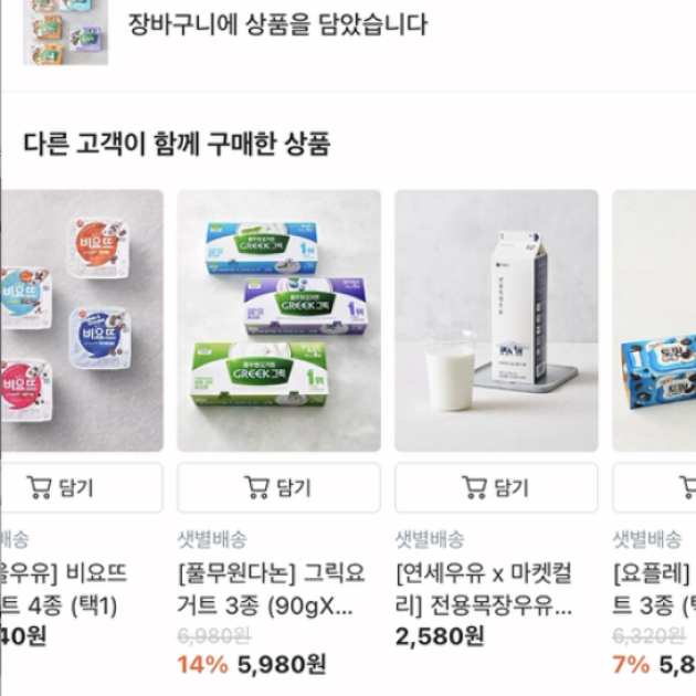 컬리는 상품을 장바구니 담은 직후, 바텀 시트로 상태 안내 메시지와 함께 연관 상품을 바로 제안합니다. 이때 [담기] 버튼만을 노출해, 추가 페이지 이동 없이 바로 상품 구매를 할 수 있게 설계했어요. 탐색 단계를 줄여 쇼핑 흐름을 끊지 않고, 구매 결정을 빠르게 이어가는 경험이 인상적입니다.
