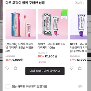 올리브영은 연관 상품 추천 바텀 시트에 찜하기·장바구니 버튼과 함께 [오늘 하루만 추천 받지 않을게요] 옵션을 제공합니다. 추천을 강요하지 않고, 사용자가 스스로 노출을 조절할 수 있게 해 반복 추천으로 인한 피로를 줄였어요. |